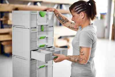 Для різноманітності у вигляді висувних шухляд: сортейнер³ надає необмежені можливості акуратного зберігання вашого оснащення. Низьку шухляду можна розділити на відсіки спеціальними розділювачами або пропонованими окремо лотками та акуратно розкласти в них дрібні деталі: цвяхи, дюбелі або гвинти. У високу шухляду можна покласти великі предмети та електроінструменти, щоб їх було зручно брати, не витрачаючи час на пошуки на робочому місці.