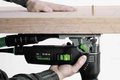 Вбудовані в плиту-основу канали пиловидалення і підключений апарат для видалення пилу Festool забезпечують ефективне видалення тирси безпосередньо із зони різання та, в результаті, гарниий огляд лінії різу і чистоту робочого місця. |